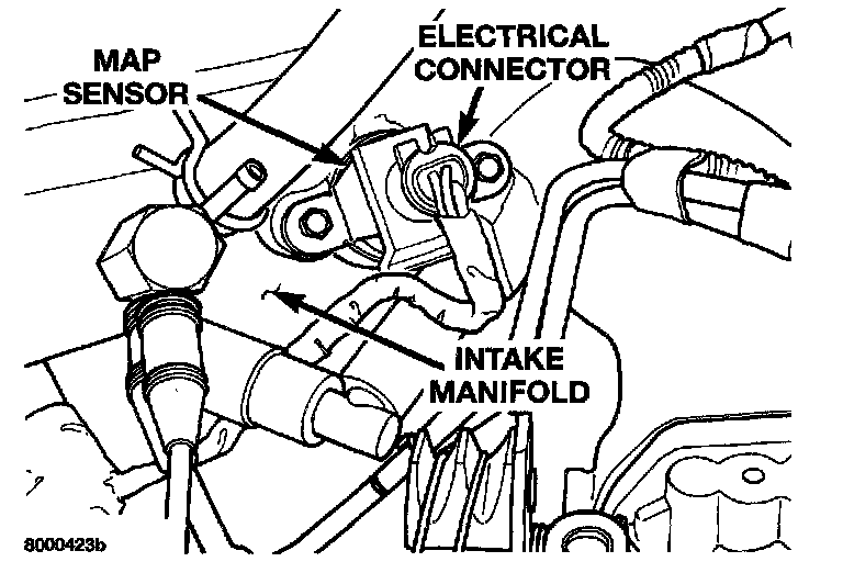 The MAP sensor mounts to the intake manifold near the throttle body inlet to the manifold. The sensor connects electrically to the PCM.