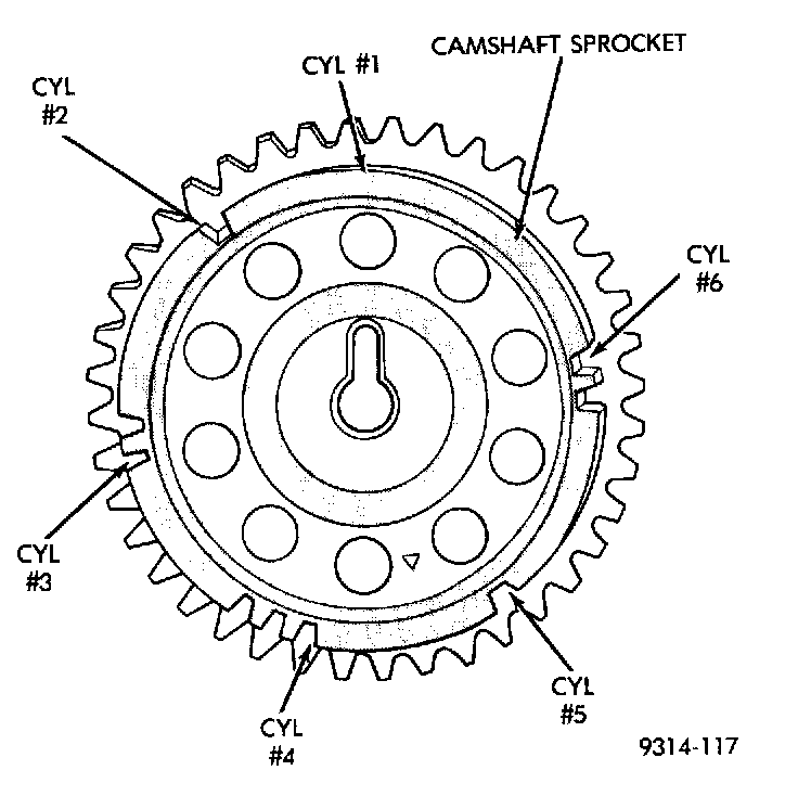 When the PCM receives two camshaft pulses followed by the long flat spot on the camshaft sprocket, it knows that the crankshaft timing marks for cylinder one are next (on driveplate). When the PCM receives one camshaft pulse after the long flat spot on the sprocket, cylinder number two crankshaft timing marks are next. After 3 camshaft pulses, the PCM knows cylinder four crankshaft timing marks follow. One camshaft pulse after the three pulses indicates cylinder five. The two camshaft pulses after cylinder 5 signals cylinder six. The PCM can synchronize on cylinders 1 or 4.