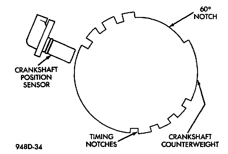 The second crankshaft counterweight has machined into it two sets of four timing reference notches and a 60 degree signature notch. From the crankshaft position sensor input the PCM determines engine speed and crankshaft angle (position).