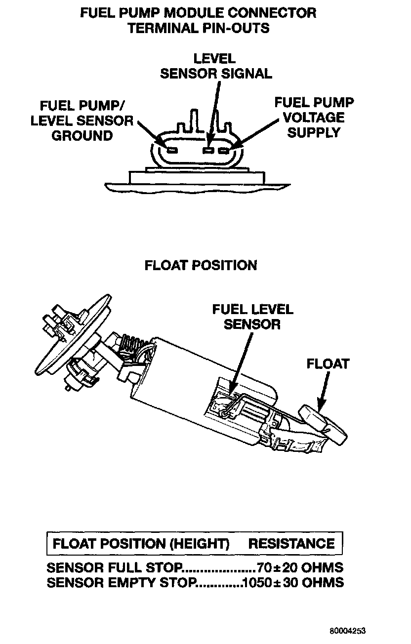 The level sensor is a variable resistor. Its resistance changes with the amount of fuel in the tank. The float arm attached to the sensor moves as the fuel level changes. To test the level sensor, connect an ohmmeter across the sensor signal and sensor ground terminals of the fuel pump module connector. Move the float lever to the positions shown in the resistance chart. Record the resistance at each point. Replace the level sensor if the resistance is not within specifications.