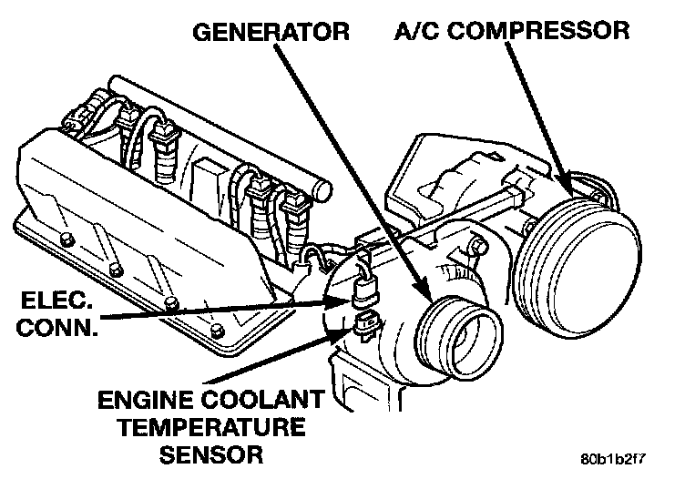 The engine coolant temperature sensor is installed into a water jacket at the front of the intake manifold located near the rear of the generator. The sensor provides an input voltage to the power- train control module (PCM) relating coolant temperature. The PCM uses this input along with inputs from other sensors to determine injector pulse width and ignition timing. As coolant temperature varies, the coolant temperature sensor resistance will change. This change in resistance results in a different input voltage to the PCM.