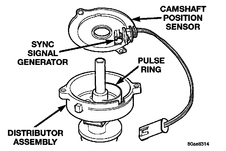 A sync signal is provide by the camshaft position sensor located in the distributor. The sync signal from this sensor works in conjunction with the crankshaft position sensor to provide the powertrain control module (PCM) with inputs. This is done to establish and maintain correct injector firing order.