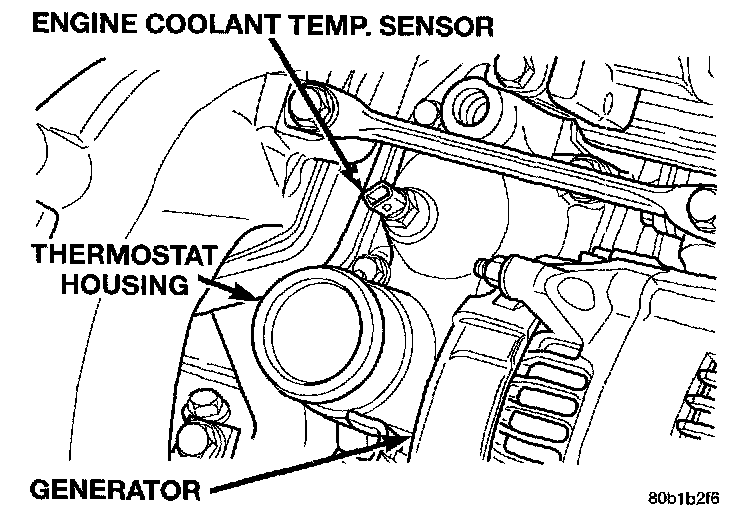 The Engine Coolant Temperature (ECT) sensor is installed into a water jacket at the front of the intake manifold located near the rear of the generator.