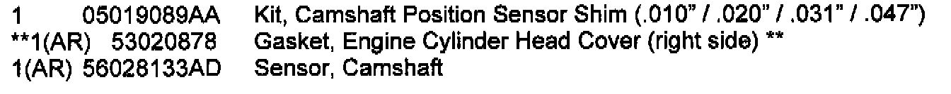 9. If necessary1 use the appropriate select fit shim (p/n 05019089AA) to adjust the air gap between the cam position sensor and the tone wheel so that an air gap of 0.76 mm +/- 0.25 mm (.030 in. +/-.010 in.) is achieved. Note that an air gap of 0.76 mm (.030 in.) is preferred.