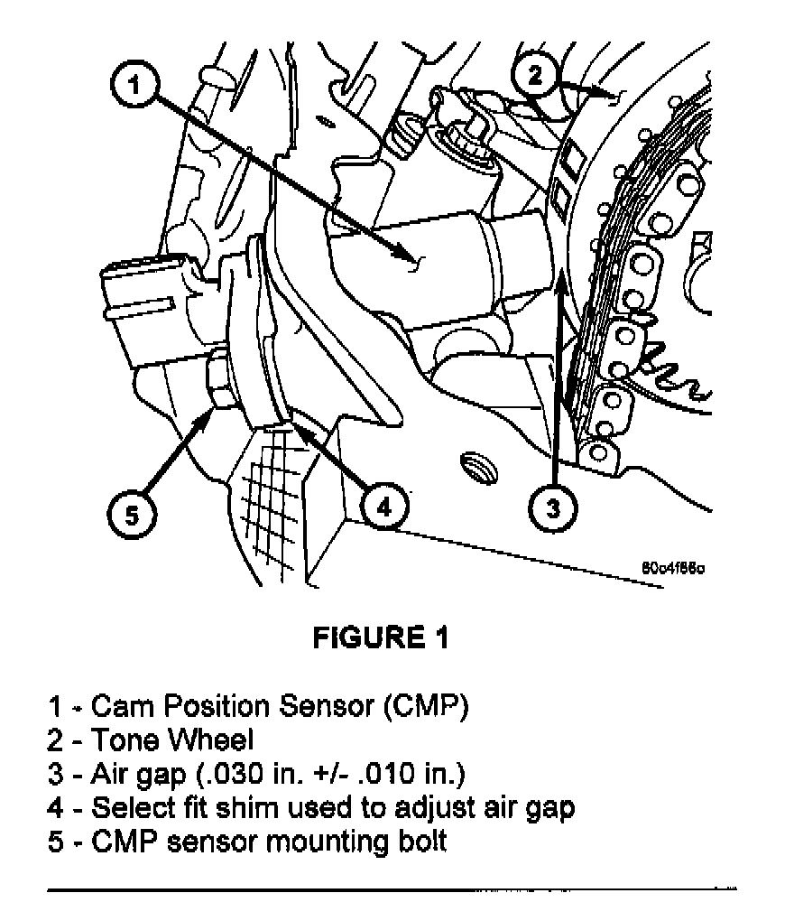 1. Observe how the cam position sensor is mounted to the engine cylinder head. Inspect for the presence of a shim between the CMP sensor and the engine cylinder head. Figure 1.