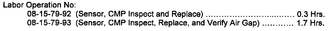 Most of the suspect engines were inspected and repaired by the engine assembly plant. If required, a select fit shim was installed between the CMP sensor and the cylinder head pad, and around the CMP sensor attaching bolt. The shim may have been glued in place to either the pad on the cylinder head or to the mounting tang on the camshaft position sensor.