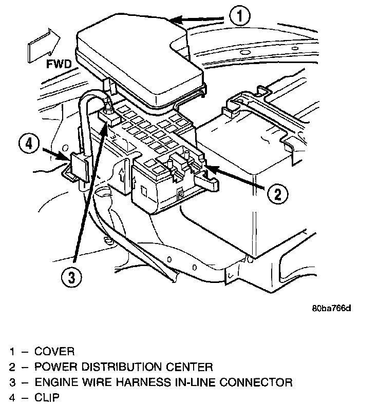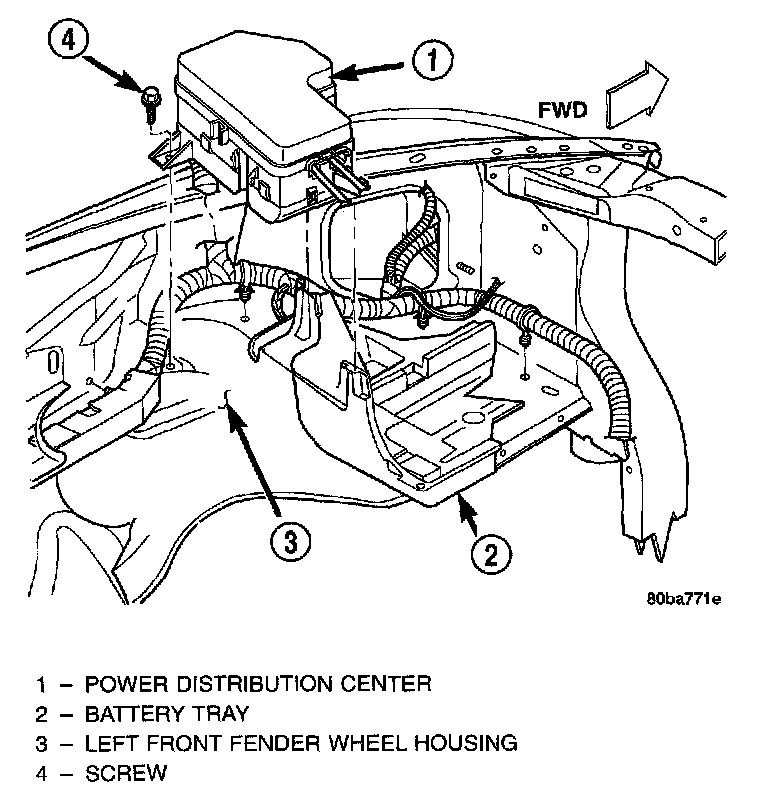 The Power Distribution Center (PDC) is serviced as a unit with the headlamp and dash wire harness. If any internal circuit of the PDC or the PDC housing is faulty or damaged, the entire PDC and headlamp and dash wire harness unit must be replaced.REMOVAL