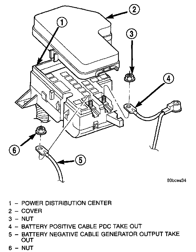 9. Remove the nut that secures the eyelet of the battery positive cable PDC take out to the forward B(+) terminal stud in the PDC and remove the eyelet from the stud.