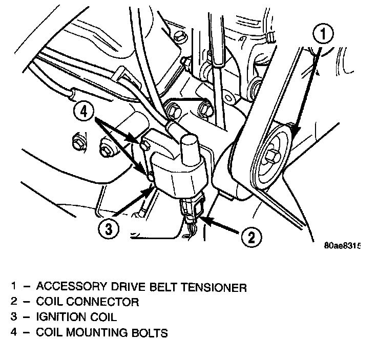 The coil is mounted to a bracket that is bolted to the front of the right engine cylinder head. This bracket is also used to mount the automatic belt tensioner.