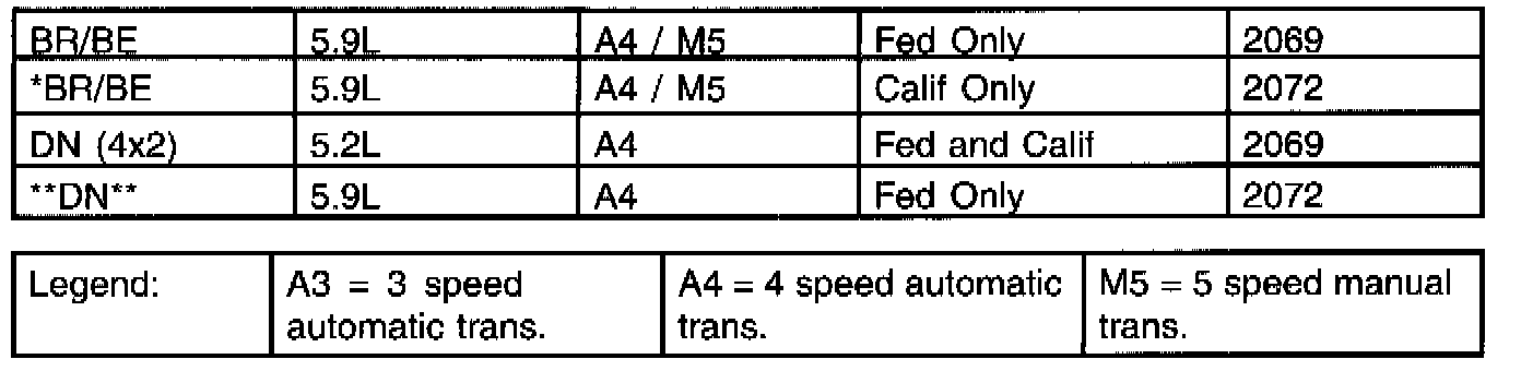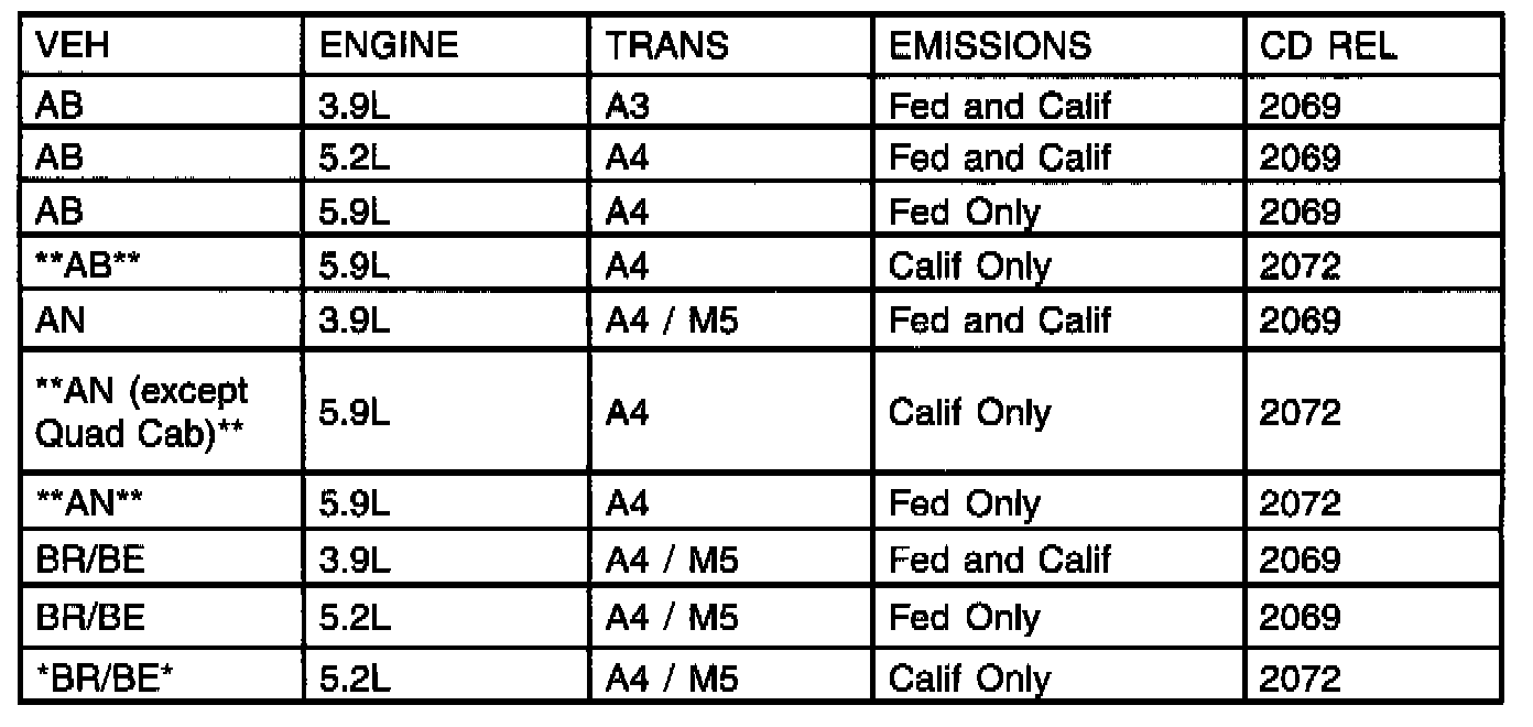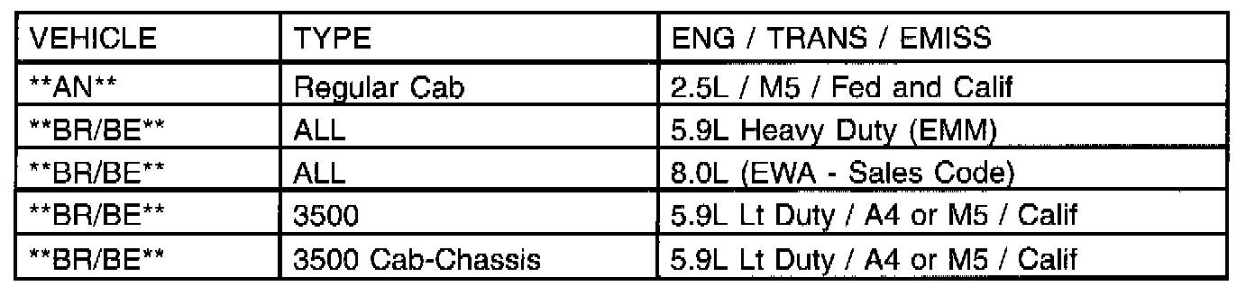 THIS BULLETIN APPLIES TO VEHICLES EQUIPPED WITH A 3.9L (EHC), 5.2L (ELF), OR 5.9L LIGHT DUTY (EML) GASOLINE ENGINE. SEE THE TWO TABLES FOR SPECIFIC APPLICATIONS AND EXCLUSIONS.