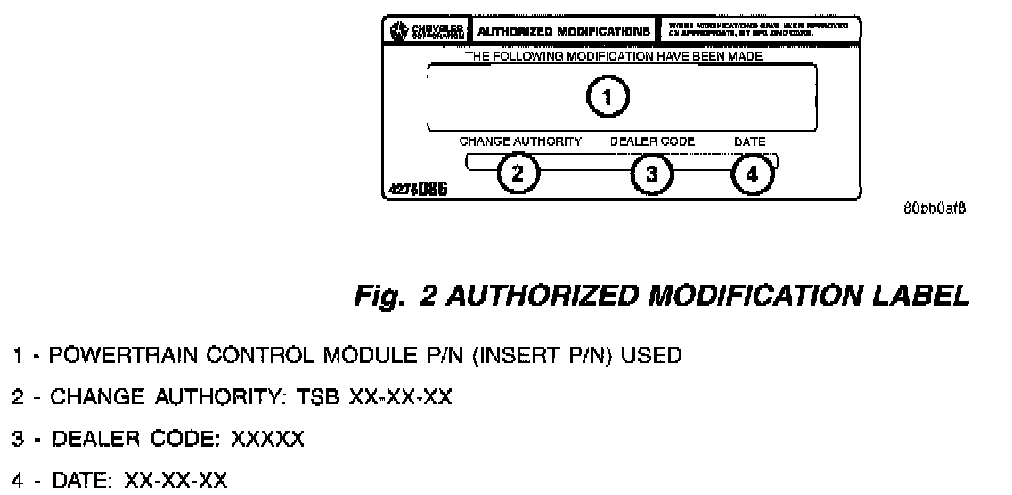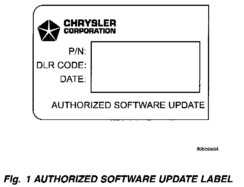 7. Type the necessary information on the "Authorized Software Update Label" p/n 04669020 (Fig. 1). Attach the label to the PCM and cover the label with the clear plastic overay.