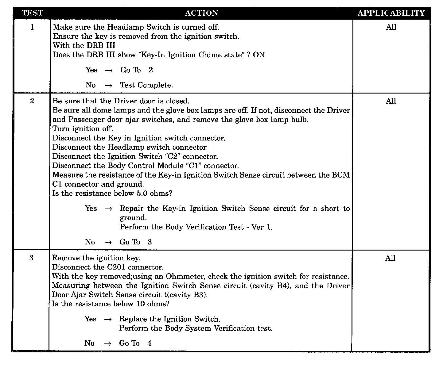 - Headlamp switch shorted test, for chime system