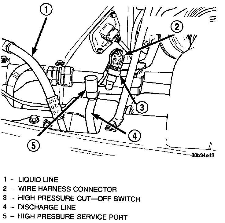 2. Unplug the wire harness connector from the high pressure cut-off switch, which is mounted to a fitting on the discharge line between the compressor and the condenser inlet.