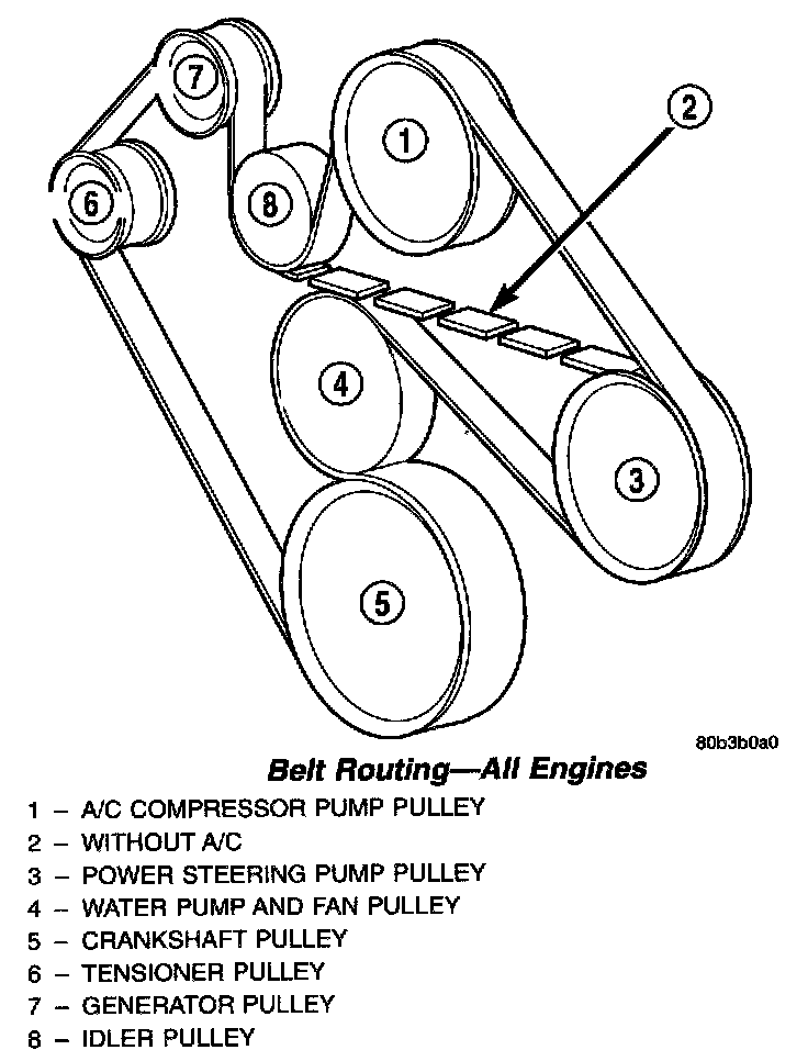 (1) Position drive belt over all pulleys except idler pulley. This pulley is located between generator and A/C compressor.