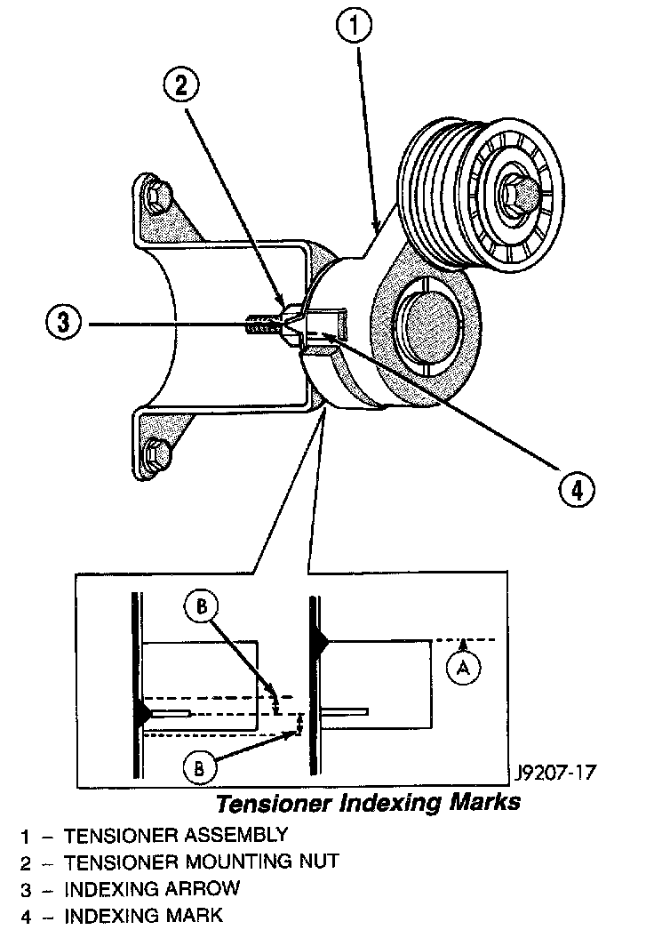 (4) The tensioner is equipped with an indexing arrow on back of tensioner and an indexing mark on tensioner housing. If a new belt is being installed, arrow must be within approximately 3 mm (1/8 inch) of indexing mark (Point B). Belt is considered new if it has been used 15 minutes or less. If this specification cannot be met, check for: