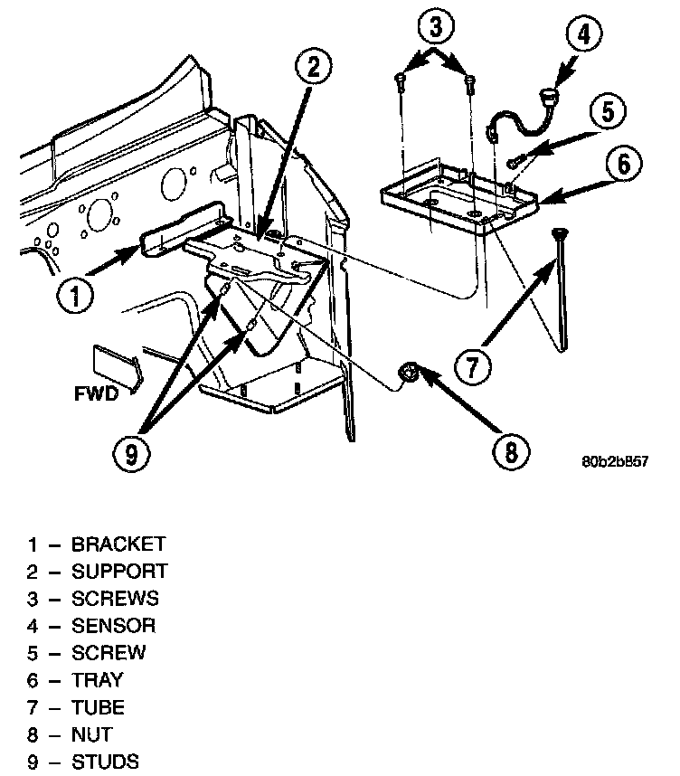 1. Feed pigtail harness through hole in top of battery tray and press sensor into top of battery tray.