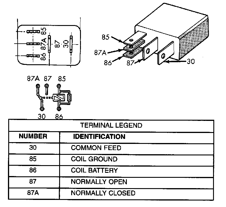 2. The relay normally closed terminal (87A) is connected to terminal 30 in the de-energized position, but is not used for this application. Go to Step 3.