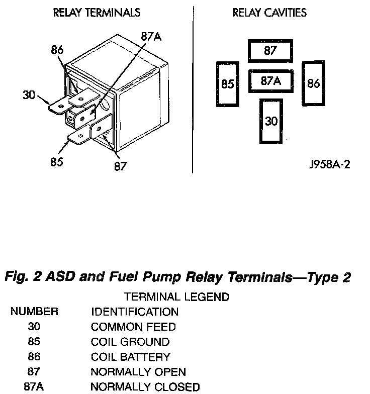 The following description of operation and tests apply only to the Automatic Shutdown (ASD) and fuel pump relays. The terminals on the bottom of each relay are numbered. Two different types of relays may be used, or.