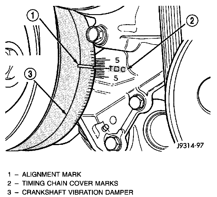 7. Slowly rotate engine clockwise, as viewed from front, until indicating mark on crankshaft vibration damper is aligned to 0 degree (TDC) mark on timing chain cover.