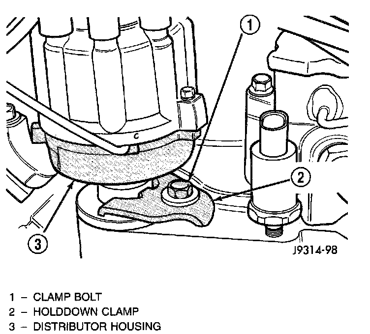 5. Install distributor holddown clamp and clamp bolt. Do not tighten bolt at this time.