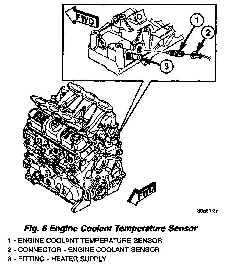 DESCRIPTIONThe engine coolant temperature sensor threads into a coolant passage on lower intake manifold near the thermostat. New sensors have sealant applied to the threads.