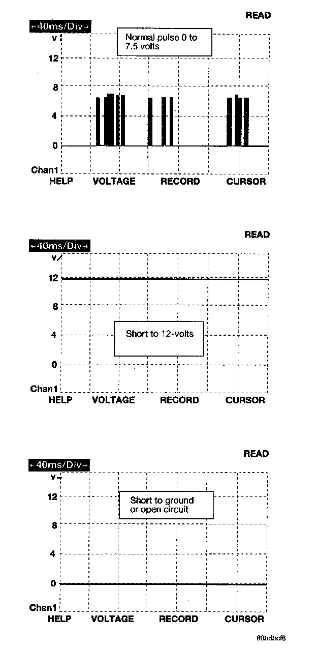 The bus messages are transmitted at a rate averaging 10800 bits per second. Since there is only voltage present when the modules transmit and the message length is only about 500 milliseconds, it is ineffective to try and measure the bus activity with a conventional voltmeter. The preferred method is to use the DRBIII(R) lab scope. The 12v square wave selection on the 20-volt scale provides a good view of the bus activity. Voltage on the bus should pulse between zero and about seven and a half volts. Refer to the figure for some typical displays.