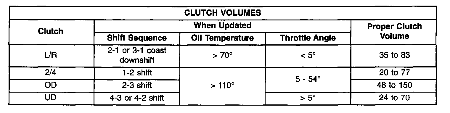 Certain mechanical problems within the clutch assemblies (broken return springs, out of position snap rings, excessive clutch pack clearance, improper assembly, etc.) can cause inadequate or out-of-range clutch volumes. Also, defective Input/Output Speed Sensors and wiring can cause these conditions. The following chart identifies the appropriate clutch volumes and when they are monitored/updated: