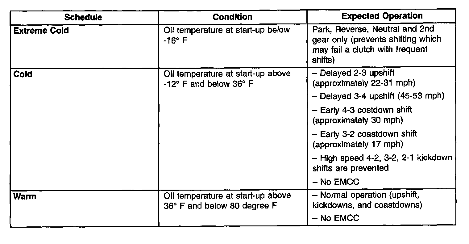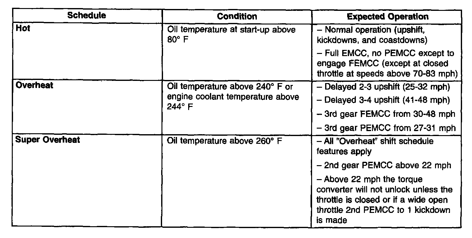 As driving conditions change, the TCM appropriately adjusts the shift schedule. Refer to the following chart to determine the appropriate operation expected, depending on driving conditions.