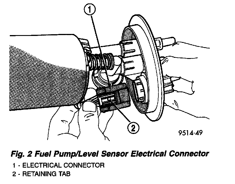 1. Depress retaining tab and remove the fuel pump/level sensor connector from the BOTTOM of the fuel pump module electrical connector.