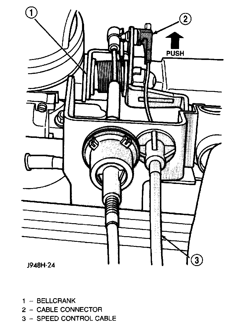2. Using finger pressure only, remove speed control cable connector at throttle body bellcrank by pushing connector off the bellcrank pin. DO NOT try to pull connector off perpendicular to the bellcrank pin. Connector Will be broken.