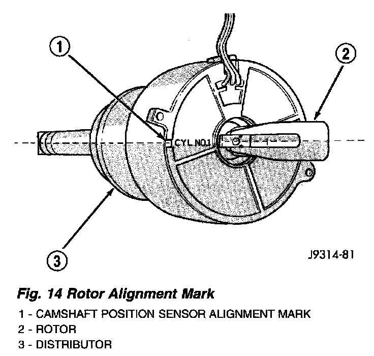 8. The distributor rotor should now be aligned to the CYL. NO.1 alignment mark (stamped) into the camshaft position sensor. If not, rotate the crankshaft through another complete 360 degree turn. Note the position of the number one cylinder spark plug cable (on the cap) in relation to rotor. Rotor should now be aligned to this position.