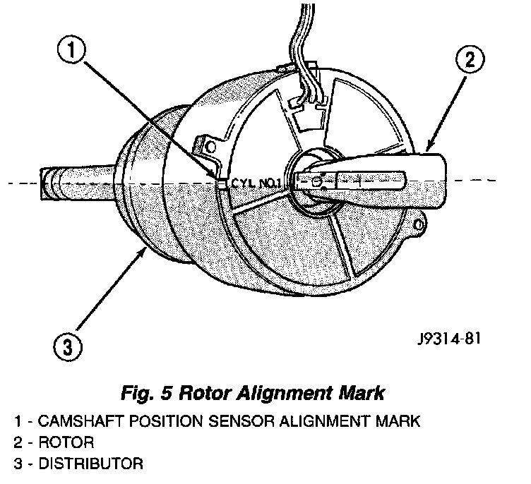 9. The distributor rotor should now be aligned to the CYL. NO.1 alignment mark (stamped) into the camshaft position sensor. If not, rotate the crankshaft through another complete 360 degree turn. Note the position of the number one cylinder spark plug cable (on the cap) in relation to rotor. Rotor should now be aligned to this position.