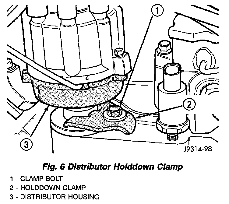 5. Install distributor holddown clamp and clamp bolt. Do not tighten bolt at this time.