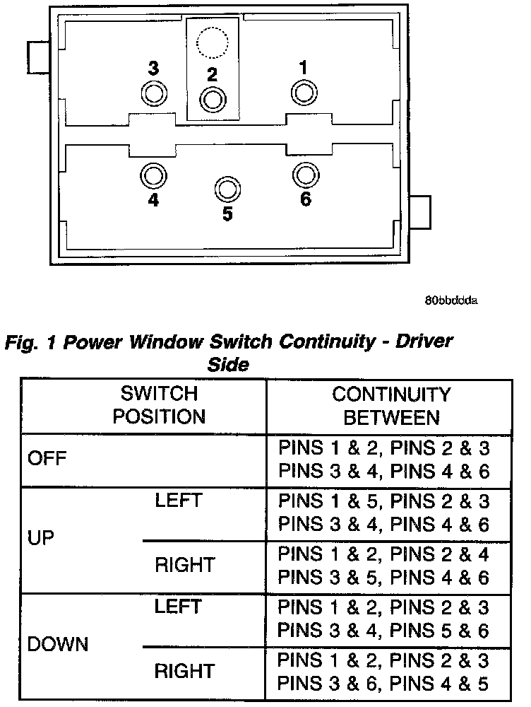 1. Remove the power window switch from the mirror flag bezel. (Refer to POWER WINDOWS/POWER WINDOW SWITCH - REMOVAL). Carefully separate the wire harness connector from the switch body.Power Window Switch Continuity - Driver Side: