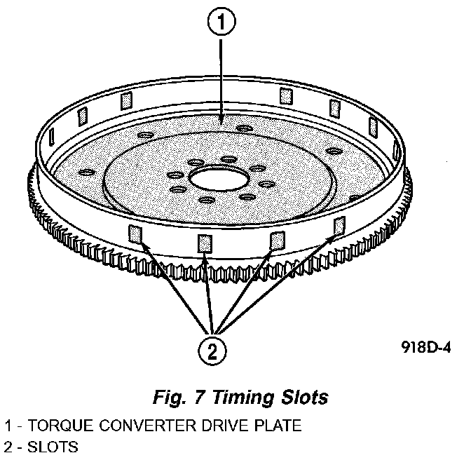 The crankshaft position sensor detects slots cut into the transmission driveplate extension. There are 3 sets of slots. Each set contains 4 slots, for a total of 12 slots. Basic timing is set by the position of the last slot in each group. Once the Powertrain Control Module (PCM) senses the last slot, it determines crankshaft position (which piston will next be at TDC) from the camshaft position sensor input. The 4 pulses generated by the crankshaft position sensor represent the 690, 490, 290, and 90 BTDC marks. It may take the PCM one engine revolution to determine crankshaft position.