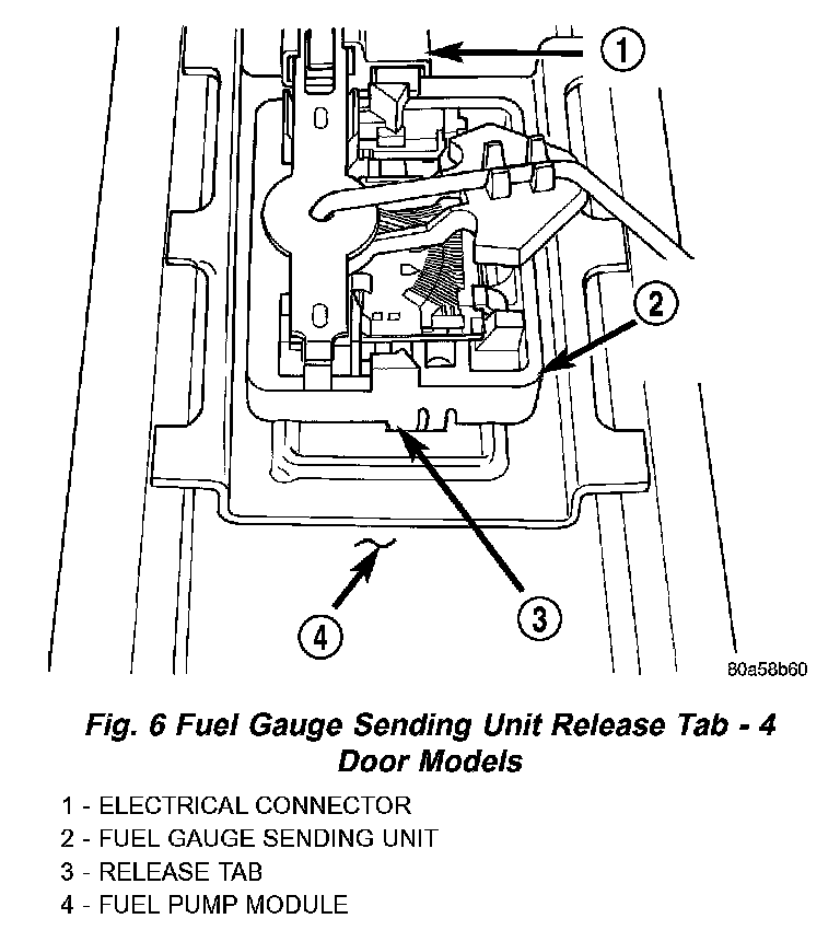 Fig. 6 Fuel Gauge Sending Unit Release Tab - 4 Door Models: