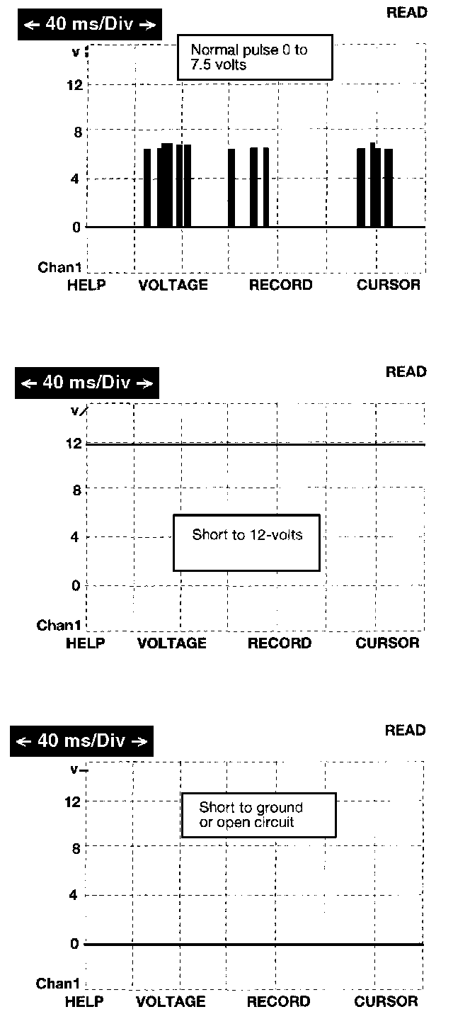 The bus messages are transmitted at a rate averaging 10800 bits per second. Since there is only voltage present when the modules transmit and the message length is only about 500 milliseconds, it is ineffective to try and measure the bus activity with a conventional voltmeter. The preferred method is to use the DRBIII lab scope. The 12v square wave selection on the 20-volt scale provides a good view of the bus activity. Voltage on the bus should pulse between zero volts and about 7-1/2 volts. It is possible for the bus to pass all DRBIII tests and still be faulty if the voltage parameters are all within the specified range and false messages are being sent. Refer to the figure for some typical displays.