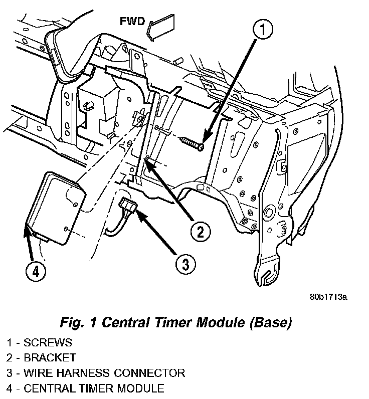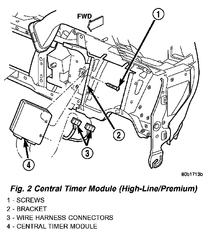 Three versions of the Central Timer Module (CTM) are available on this vehicle, a base version, a high-line version, and a premium version. Whichever version of the CTM the vehicle is equipped with, it is concealed under the driver side end of the instrument panel inboard of the instrument panel steering column opening, where it is secured to a stamped steel bracket that is integral to the instrument panel armature. The CTM is enclosed in a molded plastic housing with one (base) or two (high-line/premium) integral external connector receptacles that connect it to the vehicle electrical system through one (base) or two (high-line/premium) take outs with connectors from the instrument panel wire harness.
