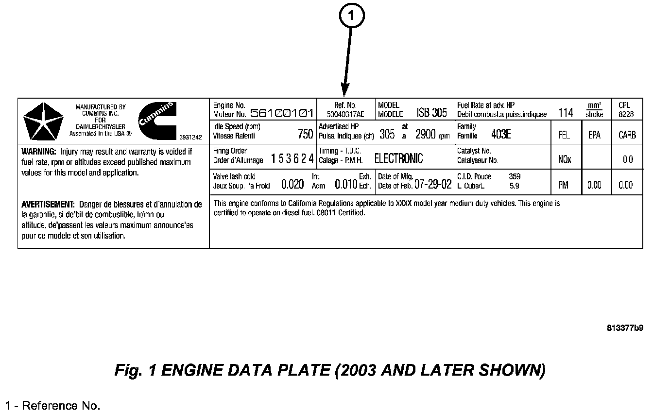 If the ECM is not operational, the "ECM part number" can be obtained from the label on the controller. For 1998 1/2 - 2002 vehicles, if the label on the controller is not legible, proceed to next step. For 2003 and later vehicles, if the label on the controller is not legible, record the "Reference No." for use later. The "Reference No." is located in the Reference No. box at the top, center of the Engine Data Plate (Fig. 1). Do not use the reference number shown in the figure. The Engine Data Plate is located on the intake side of the breather cover or affixed to the APPS bracket.