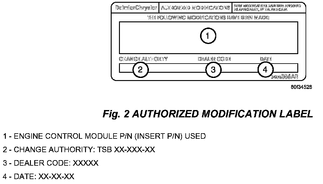 27. Type the necessary information on the "Authorized Modification Label" p/n 04275086AB and attach near the VECI label (Fig. 2).