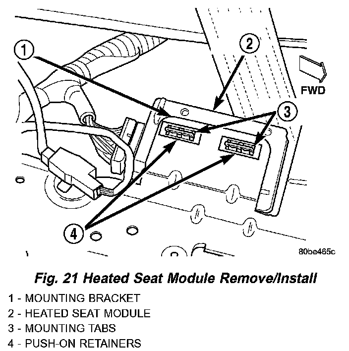 REMOVAL1. Working under the center front seat console, cut the tie strap and remove the two push-on retainers that secure the mounting tabs of the heated seat module to the of the mounting bracket.