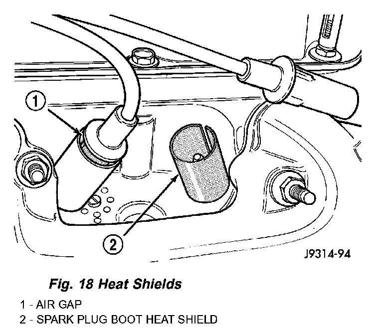 On 3.9L V-6 and 5.2/5.9L V-8 engines, spark plug cable heat shields are pressed into the cylinder head to surround each cable boot and spark plug.
