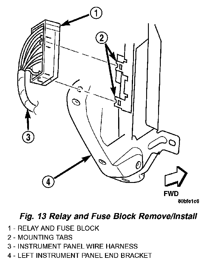 7. Disengage the relay and fuse block from the two mounting tabs on the inboard side of the left instrument panel end bracket (Fig. 13).