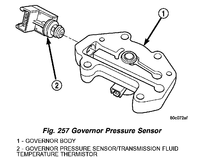 Transmission fluid temperature readings are supplied to the transmission control module by the thermistor (Fig. 257). The temperature readings are used to control engagement of the fourth gear overdrive clutch, the converter clutch, and governor pressure. Normal resistance value for the thermistor at room temperature is approximately 2000 ohms.
