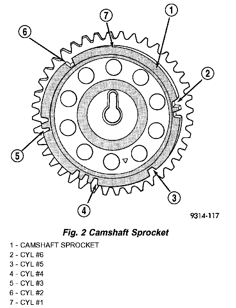 When the PCM receives 2 cam pulses followed by the long flat spot on the camshaft sprocket, it knows that the crankshaft timing marks for cylinder 1 are next (on driveplate). When the PCM receives one camshaft pulse after the long flat spot on the sprocket, cylinder number 2 crankshaft timing marks are next. After 3 camshaft pulses, the PCM knows cylinder 4 crankshaft timing marks follow. One camshaft pulse after the 3 pulses indicates cylinder 5. The 2 camshaft pulses after cylinder 5 signals cylinder 6. The PCM can synchronize on cylinders 1 or 4.