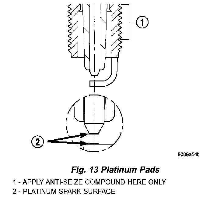 When the spark plugs use a single or double platinum tips and they have a recommended service life of 100,000 miles for normal driving conditions per schedule A in this manual. The spark plugs have a recommended service life of 75,000 miles for severe driving conditions per schedule B in this manual. A thin platinum pad is welded to both or center electrode end(s) as shown. Extreme care must be used to prevent spark plug cross threading, misgaping and ceramic insulator damage during plug removal and installation.