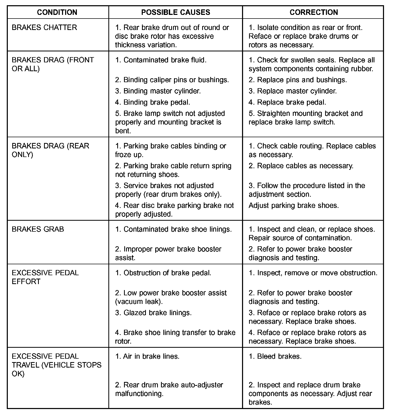 DIAGNOSIS AND TESTING - BASE BRAKE SYSTEMNOTE: There are three diagnosis charts following that cover the RED BRAKE WARNING INDICATOR LAMP, BRAKE NOISE and OTHER BRAKE CONDITIONS.