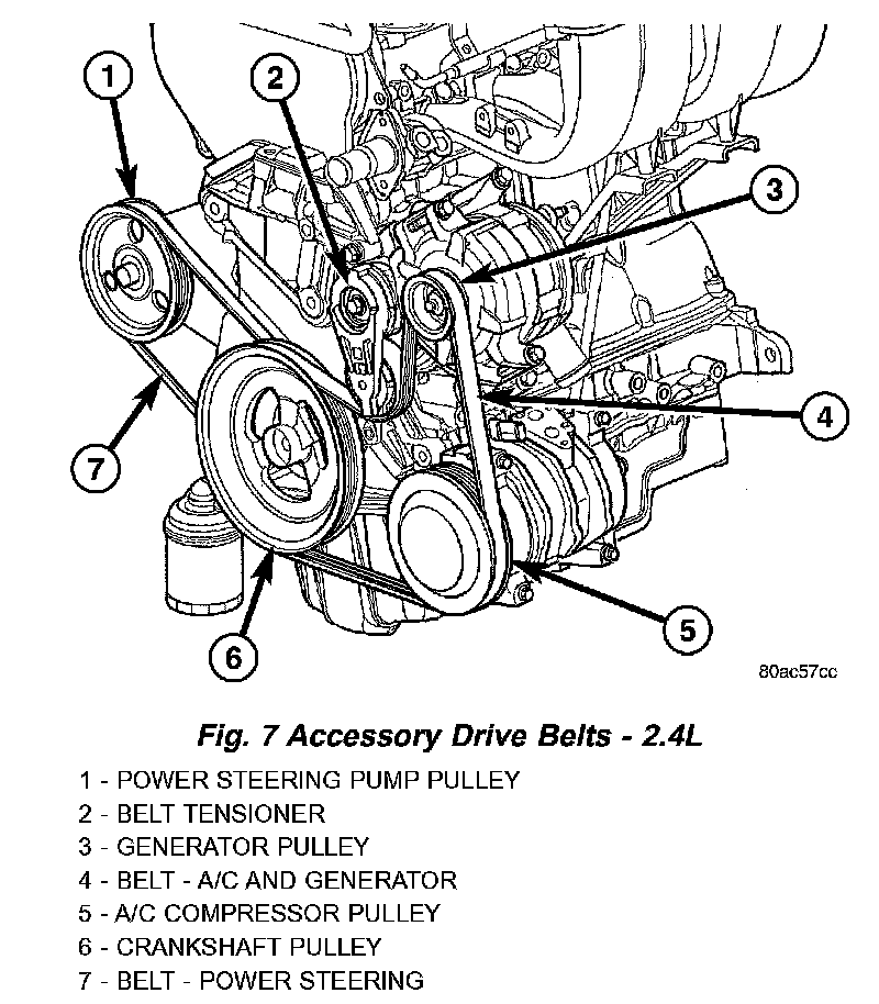 1. Install belt onto all pulleys except for the crankshaft (Fig. 7).