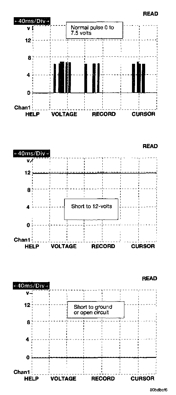 The bus messages are transmitted at a rate averaging 10800 bits per second. Since there is only voltage present when the modules transmit and the message length is only about 500 milliseconds, it is ineffective to try and measure the bus activity with a conventional voltmeter. The preferred method is to use the DRBIII lab scope. The 12 v square wave selection on the 20-volt scale provides a good view of the bus activity. Voltage on the bus should pulse between zero and about 7 1/2 volts. Refer to the following figure for some typical displays.