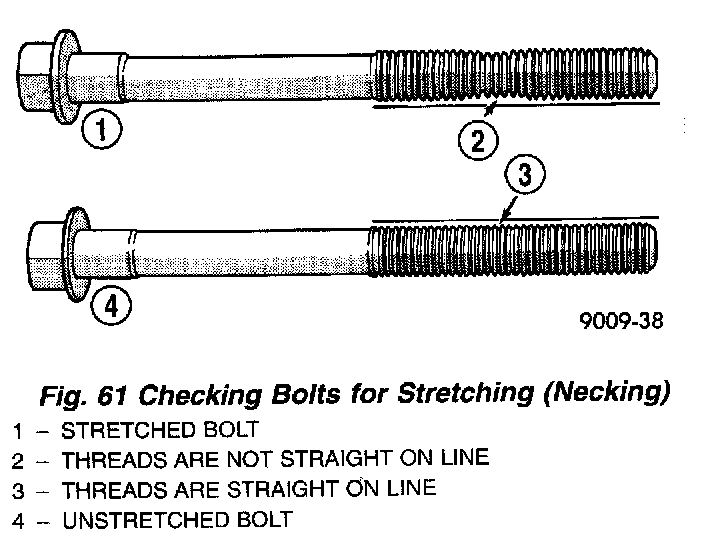 1. The cylinder head bolts are torqued using the torque yield method; they should be examined BEFORE reuse. If the threads are necked down, the bolts must be replaced (Fig. 61).